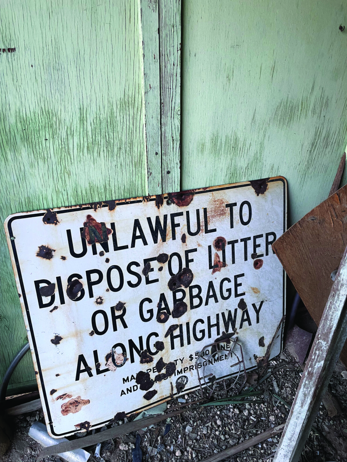 A 4WD vehicle became necessary as we approached the ruins of the Aztec Wells mining community just a few miles past de la Garza’s cabin. The desert preserves even while it destroys and we found a few well kept private homes with dire “No Trespassing” signs next to desiccated trailers ravaged by the desert wind and critters. Care and neglect are neighbors at Aztec Wells. We wandered deeper into the entropy of the abandoned mining town and found rooms full of dried droppings, piles of old shake shingles, plastic knives strewn about on the ground.