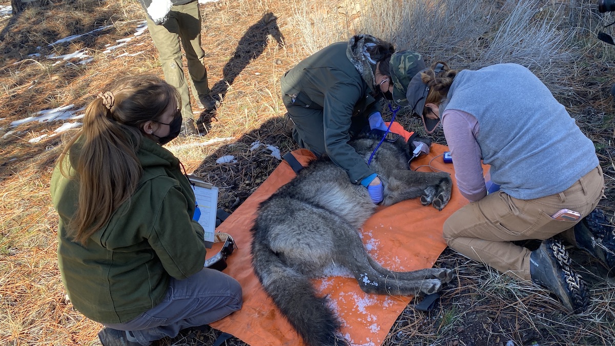 Immediately after capture, each wolf was flown to a nearby field processing site and fitted with a satellite/VHF collar. CDFW veterinary and biological staff also collected standard biological data, including body measurements, DNA and blood samples. These data allow CDFW to monitor wolf health, screen for disease, and assess genetic relatedness among individuals and packs. After collaring, each wolf was released on public land as close as practical to its capture location.
