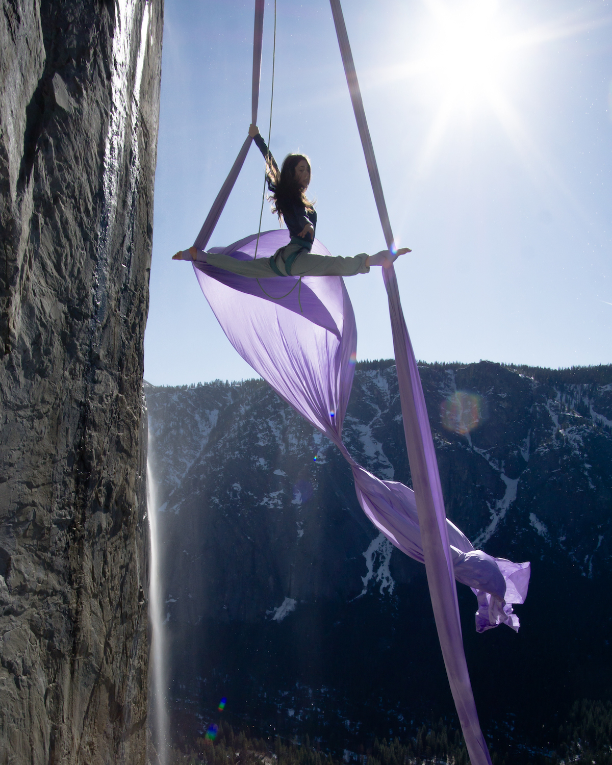 Sheridan and Mewborne’s strong big wall climbing skills, where they rely on pitons hammered into thin cracks to ascend the massive walls of Yosemite, allow them to access vertical locations seen by very few. Midway up these routes, Mewborne does aerial silks with the security of the climbing rope tied to her harness and tucked out of view. In one image she posted on Instagram (@lovealwayspriscilla), she hangs inverted, with her silks wrapped around one leg and firmly clasped with one hand. Snow-filled gullies shine in the background and Horsetail Fall, which spills over the precipice from the top of El Cap, flows behind her.